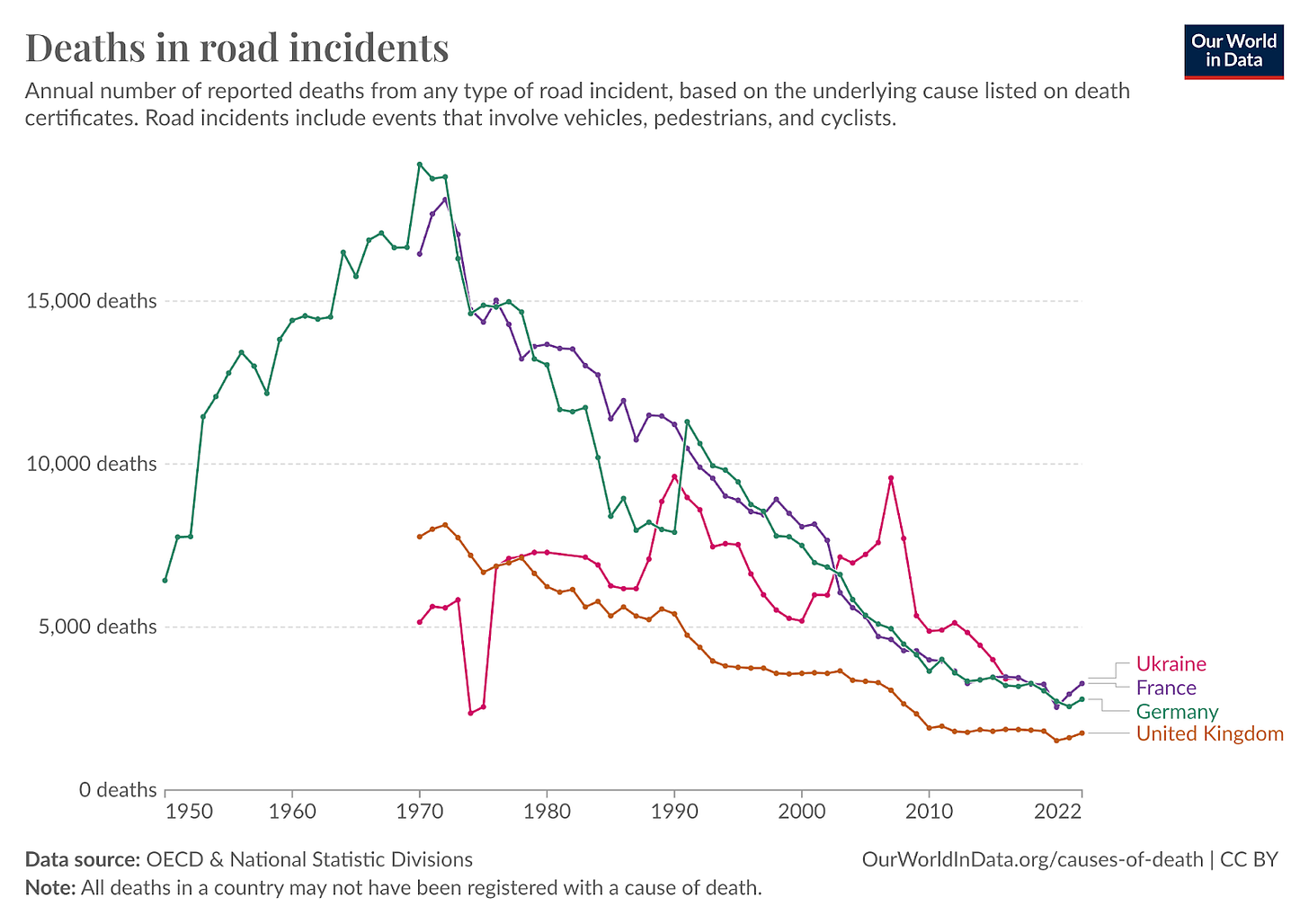 Why did road deaths start to decrease? It certainly wasn’t because cars were getting any slower. Deaths were reduced through a number of societal and technological interventions, including adaptation.