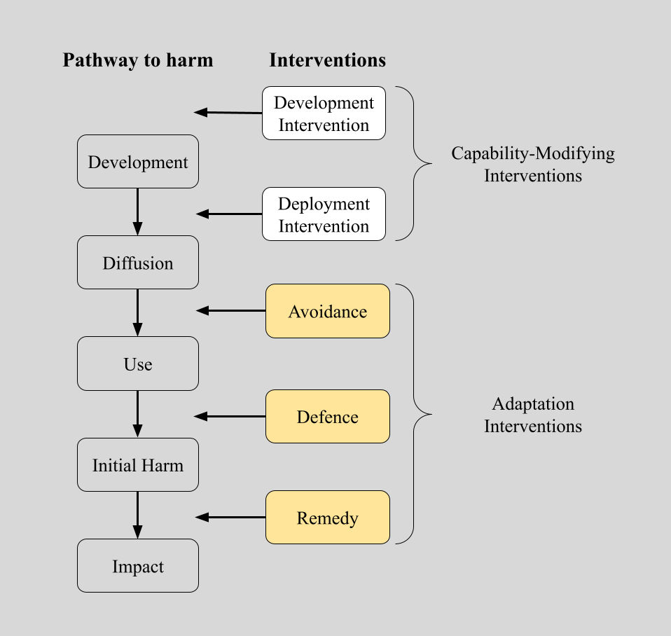 I and my colleagues give a more formal definition of AI adaptation, in a recent paper (see figure below). The first column tracks a five-step progression by which an AI system could have a negative impact on the world. At the second level, it identifies types of intervention at each step. Many approaches to AI safety aim to stop dangerous capabilities from diffusing in the first place, thus only involving the grey boxes in the diagram below.