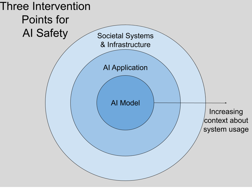 Traditionally, we might try to prevent harmful usage by having AI models refuse to carry-out malicious requests, or by monitoring inputs and outputs to a closed-source model. However a broader approach is necessary, since model-focused approaches like these faces three key challenges: